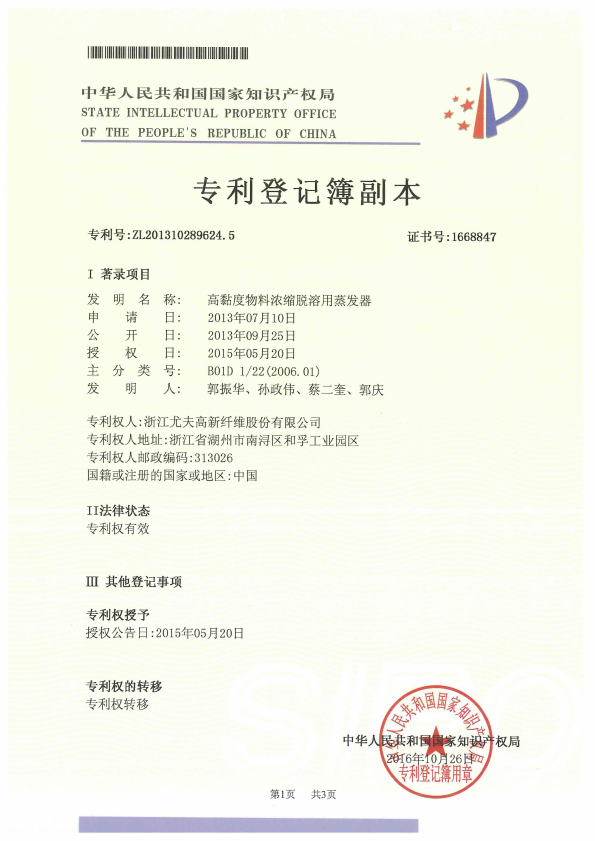 • 高黏度物料濃縮脫溶用蒸發(fā)器 受讓專利登記簿